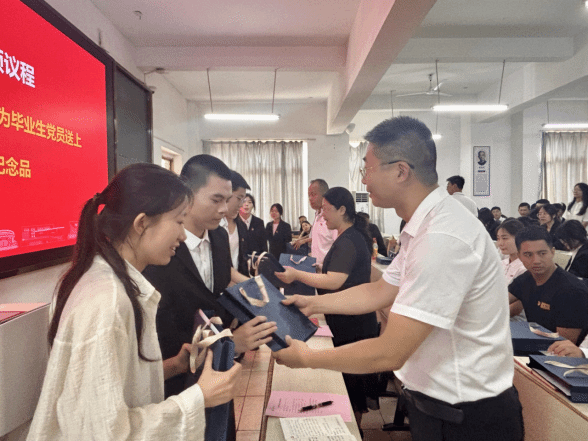 大会第三项议程,学院老师为毕业生党员送上纪念品。 一份份精心准备的纪念品,不仅承载着学院对学子们的深厚情谊,更蕴含着对每一位毕业生党员未来征程的美好祝福。当老师们将纪念品递到党员手中时,现场气氛温馨而感人。这份特别的礼物,将成为连接母校与毕业生党员的温暖纽带,激励他们不断前行。