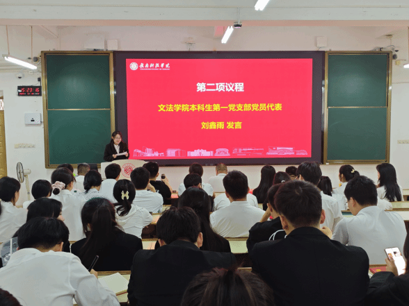 大会第二项议程,学生党员代表刘鑫雨、段盼豪发言。 他们先后走上讲台,分享了自己在党组织培养下的成长感悟与心路历程。刘鑫雨同志结合参与支部建设和专业实践的经历,表达了对母校和党组织的深切感激;段盼豪同志则围绕学生党员的责任与担当,抒发了将不负时代、勇毅前行的坚定决心。他们的发言情真意切,展现了2025届毕业生党员昂扬的精神风貌和接过历史接力棒的饱满热情。