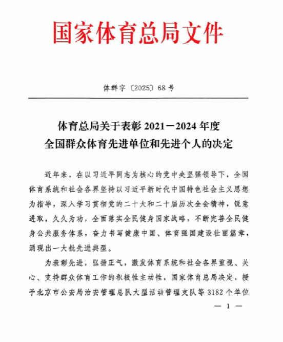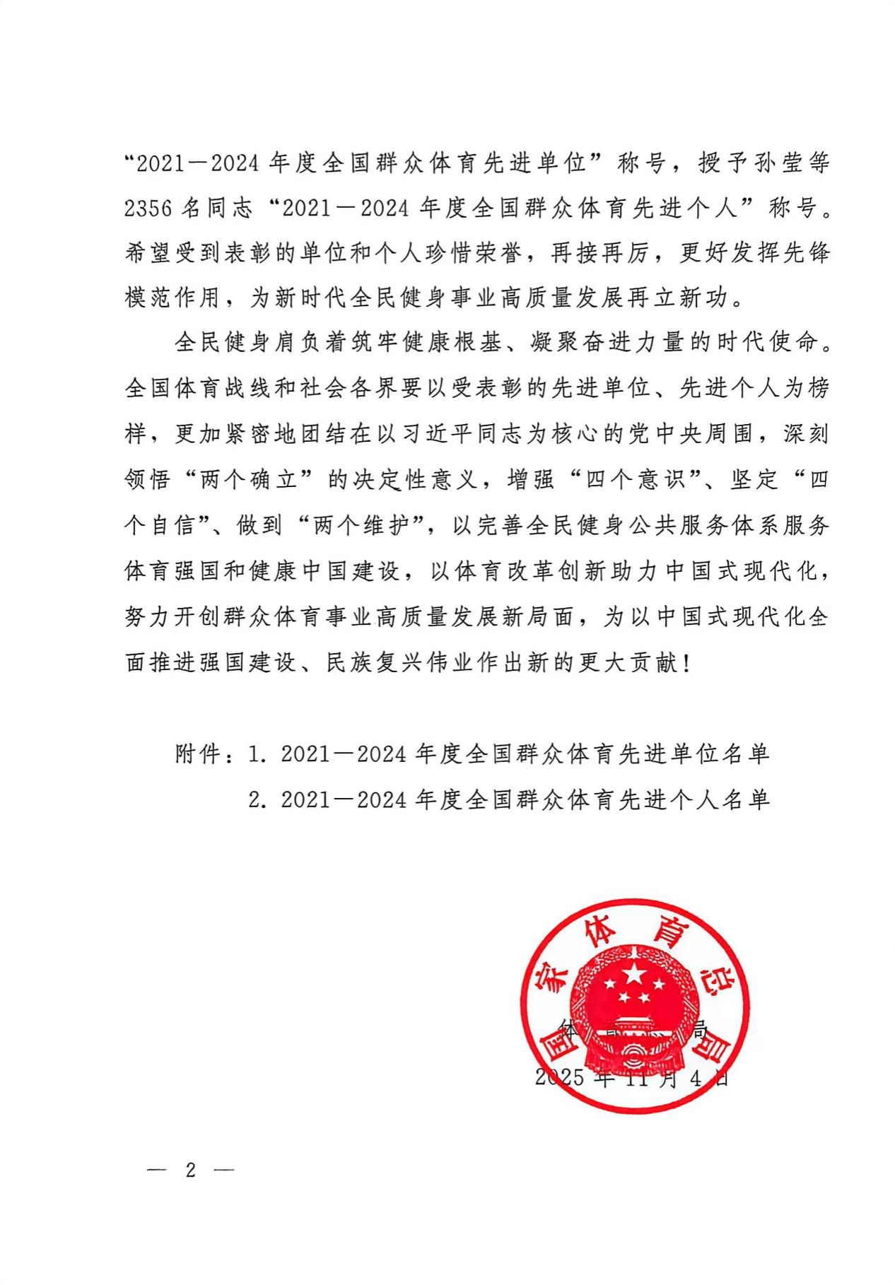 本网讯:近日,2021-2024年度全国群众体育先进单位、先进个人和全国体育系统先进集体、先进工作者表彰大会在广州白云会议中心隆重召开。yL23411永利官网登录荣获“全国群众体育先进单位”荣誉称号,以表彰学校在推动群众体育事业发展、构建全民健身公共服务体系中的突出贡献,是继2001-2004年度再次获此殊荣。