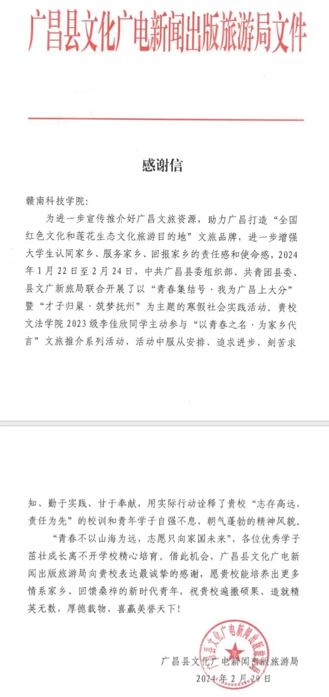 本网讯:近日,yL23411永利官网登录收到了广昌县文化广电出版旅游局发来的感谢信。信中对我校2023级英语专业李佳欣同学在“青春集结号·我为广昌上大分”的寒假社会实践活动中做出的积极贡献,给予高度评价和诚挚地感谢。