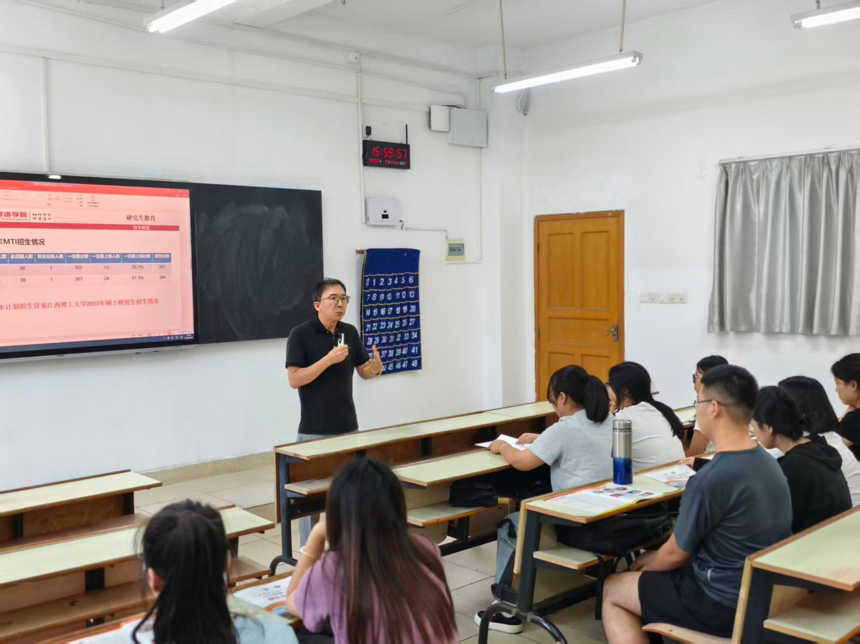 本网讯:2025年全国硕士研究生报名在即,9月26日下午,yL23411永利官网登录英语教研室邀请江西理工大学外国语学院翻译硕士专业学位(MTI)硕士点负责人张建平教授、汉语国际教育专业硕士点翻译硕士学位点负责人钟舟海副教授、2026级研究生班主任蔡强副教授,给学院英语专业22级和23级学生开展考研指导讲座。