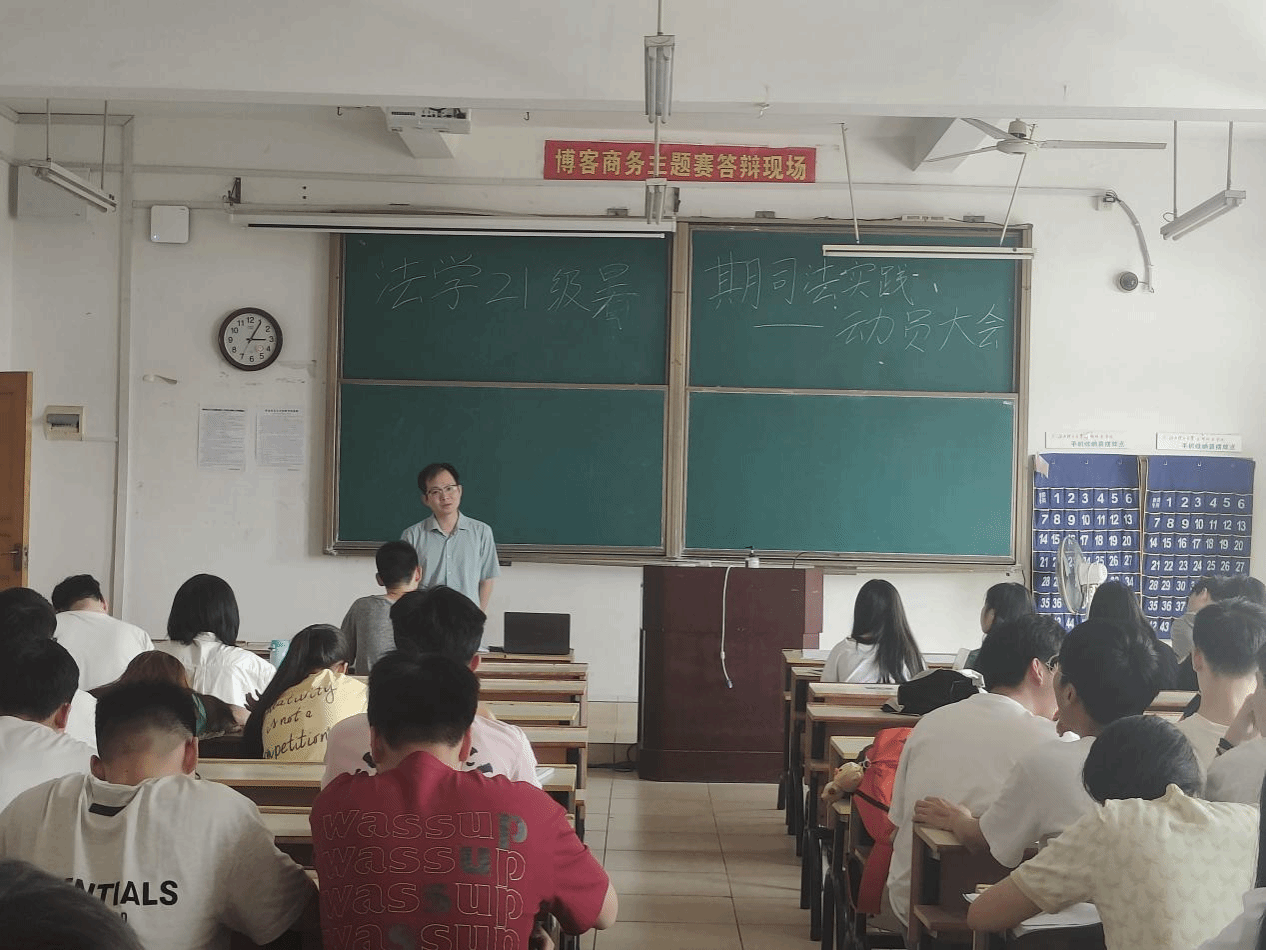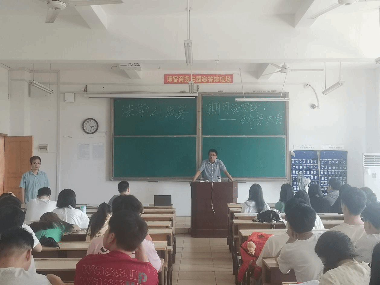 为进一步提高法学专业学生实践能力,引导学生将法学理论与实践相结合,保证暑期司法实践工作顺利开展,2021级法学专业暑期司法实践动员大会于6月26日下午在主教学楼Z202教室召开,人文科学系副主任何建军、法学教研室主任刘翛然、法学21级班主任欧阳东和21级法学专业全体学生参加了此次动员大会。