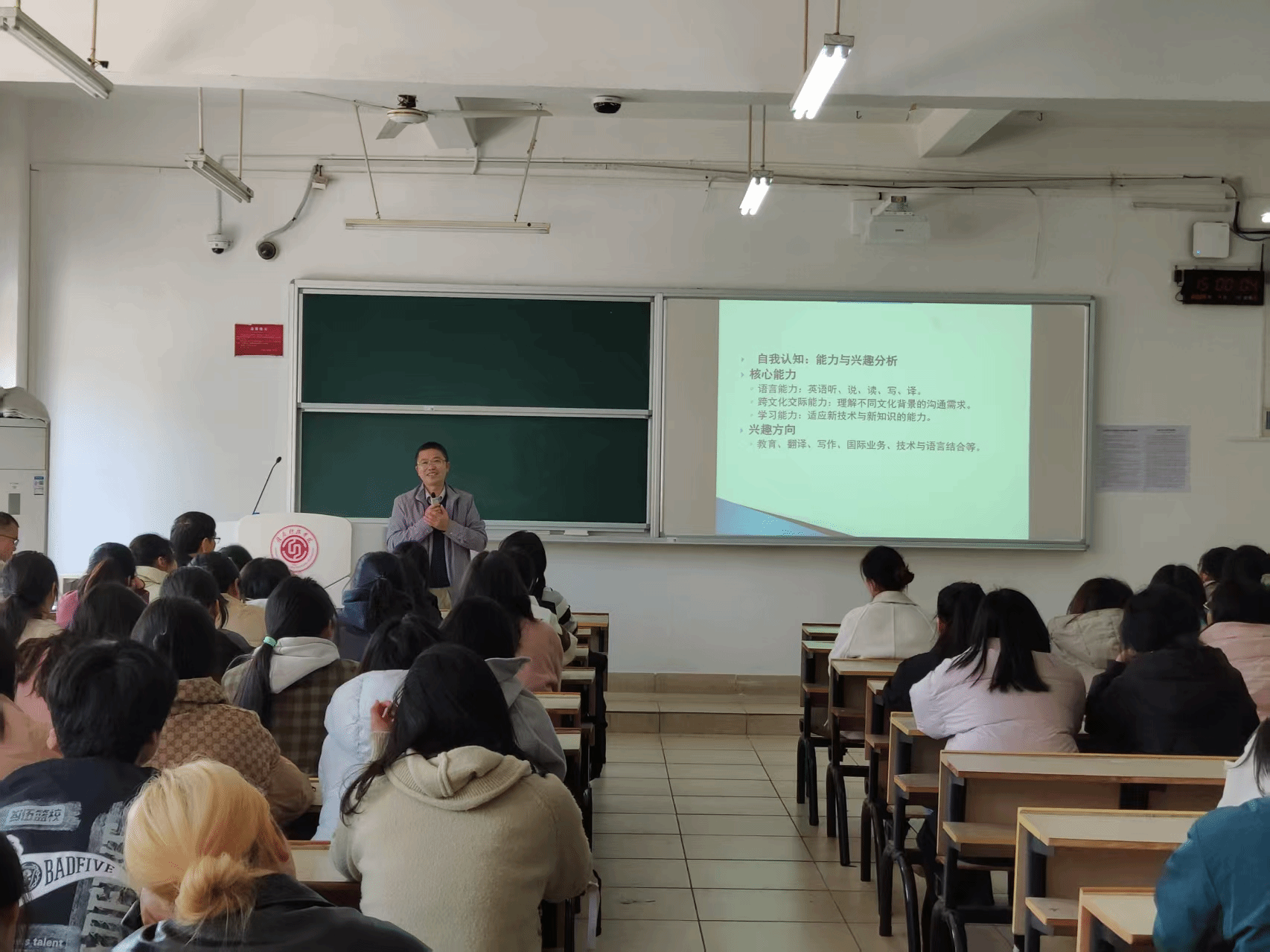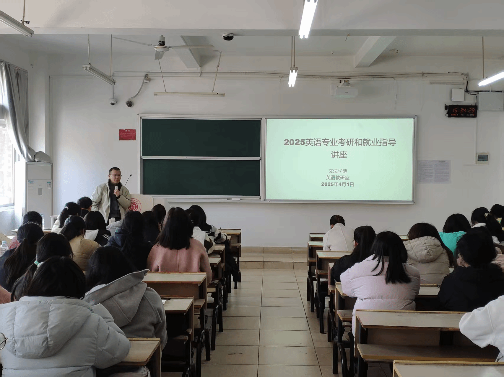 4月1日下午,yL23411永利官网登录英语教研室邀请了江西理工大学外国语学院翻译硕士学位点负责人张建平教授、国际中文硕士学位点负责人钟舟海副教授、本科英语专业校级重点学科负责人陈二春教授,给yL23411永利官网登录英语专业学生开展考研和就业指导讲座。