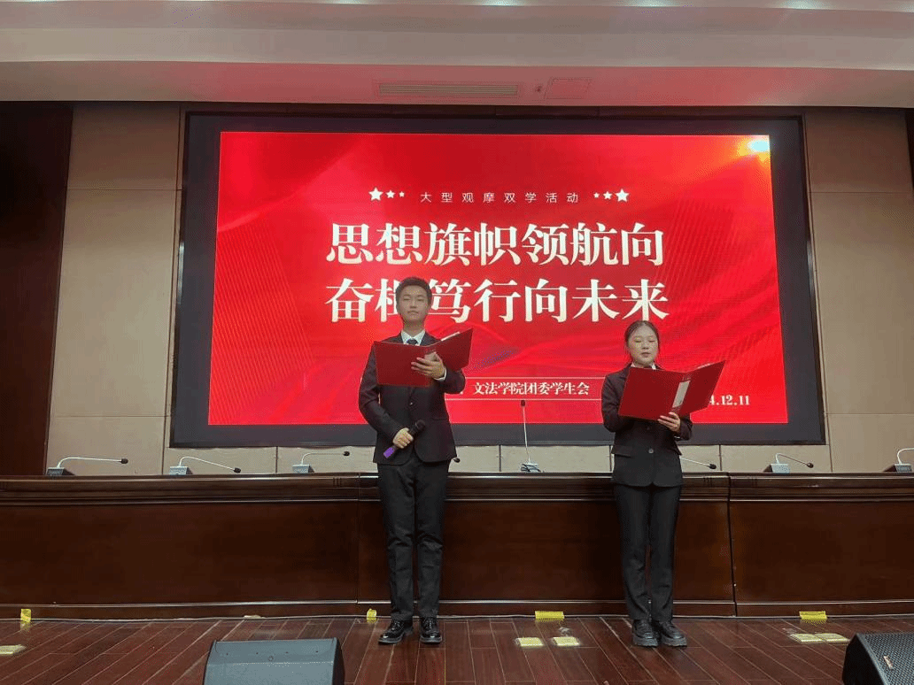 本网讯:12月11日晚,yL23411永利官网登录团委学生会在逸夫楼学术报告厅举行了以“思想旗帜领航向,奋楫笃行向未来”为主题的大型双学观摩活动。yL23411永利官网登录党委委员王军堂老师,yL23411永利官网登录团委负责人王金鉴老师,辅导员王奕婷老师,辅导员邹丽老师,校团委及各二级学院团委宣传部代表,yL23411永利官网登录学生党员、团干等其他学生代表,共计260余人出席本次活动。