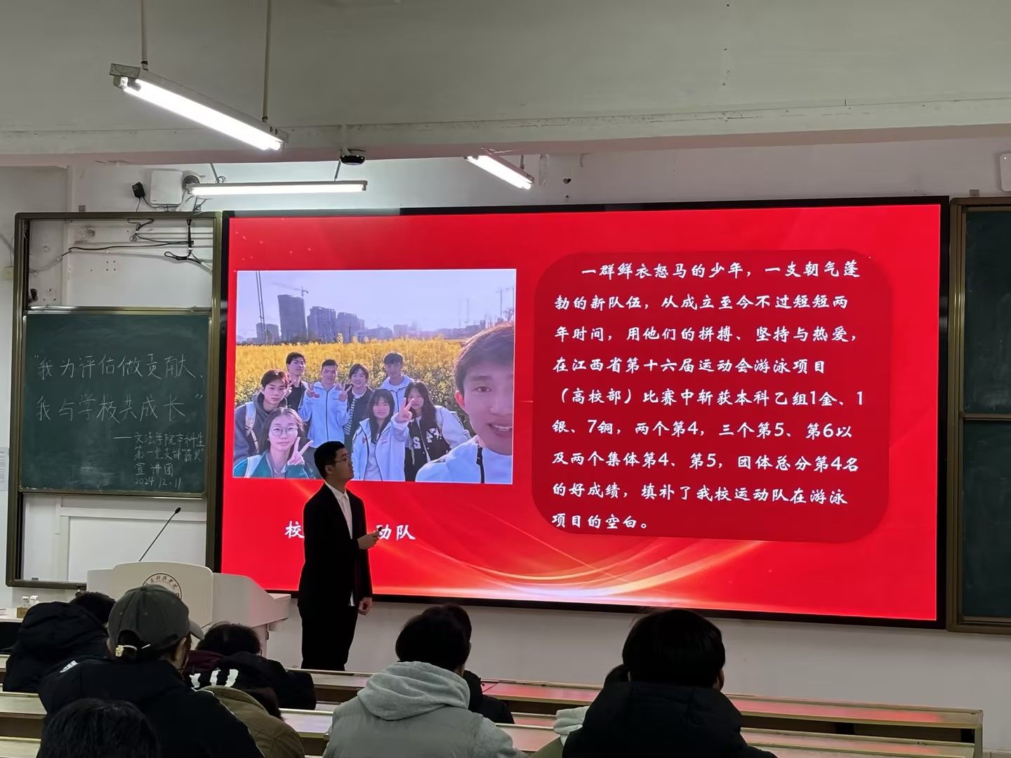12月11日-12日,yL23411永利官网登录本科生第一党支部“薪火”宣讲团面向全体2024级学生开展了“我为评估做贡献,我与学校共成长”主题宣讲活动。活动伊始,宣讲员带领大家共同学唱《赣科学子迎评歌》,让同学们更加直观地了解学校评估的重要性和意义。随后,宣讲员邀请同学们分享身边的榜样故事,通过讲述优秀学长学姐和教师在评估工作中的先进事迹,激励同学们向他们学习,为学校迎评促建贡献青春力量。