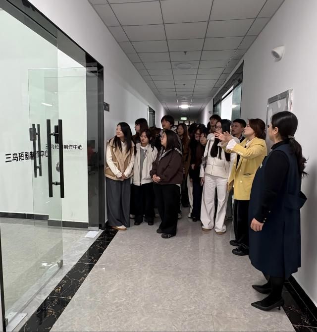 当日上午,师生一行抵达叁鸟(赣州)科技有限公司后,在企业对接人的带领下开启了工作岗位与工作环境考察。公司团队首先围绕短剧行业发展现状、核心业务板块及人才需求方向进行介绍,重点展示了短剧制作中的视觉设计、数字后期、场景搭建等关键环节。视觉传达设计专业学生认真观察短剧海报设计、角色形象视觉包装的工作流程,与企业设计师交流品牌视觉符号在短剧中的运用技巧;数字媒体艺术专业学生聚焦后期剪辑、特效制作、短视频运营等岗位,详细询问软件操作要求与项目周期管理细节;环境设计专业学生则针对短剧实景拍摄场地的空间规划、场景氛围营造与功能性设计展开调研,深入了解行业对空间设计的实战需求。实地考查让学生们跳出课堂理论框架,直观感受到设计学科在影视行业的应用场景,为职业规划提供了清晰参考。